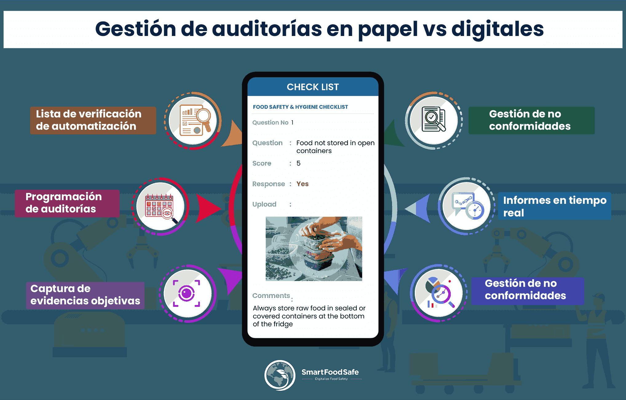 Smart Audit de SmartFoodSafe es una herramienta vital de cumplimiento para lograr cumplimiento en auditorías en diversas industrias. Aprovechando la tecnología, esta herramienta de gestión de auditorías automatiza y centraliza procesos de auditoría, asegurando precisión, eficiencia y análisis de datos en tiempo real. Smart Audit permite a las empresas identificar brechas, implementar acciones correctivas rápidamente y mantener cumplimiento regulatorio de manera efectiva, impulsando excelencia operativa y mitigación de riesgos.