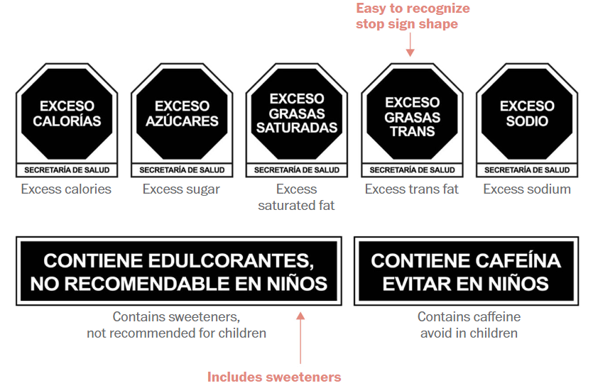 Mexico adopted similar stop-sign-shaped warning labels in 2020, which also include mandatory disclosures for non-sugar sweeteners like sucralose and stevia. This move addresses concerns observed in Chile, where the use of non-sugar sweeteners increased after the introduction of FOP labels, particularly in products that reduced sugar content to avoid carrying a warning label.